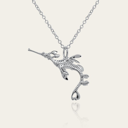 Weedy Sea Dragon necklace. Made from highly polished, tarnish resistant silver, hung on a solid silver chain. © Adrian Ashley