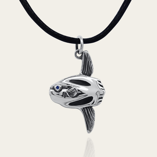 Mola mola necklace. Made from sterling silver with an antiqued finish, set with a gemstone eye. Ocean sunfish or moonfish © Adrian Ashley