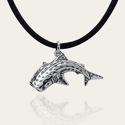 Whale shark necklace. Made from sterling silver with an antiqued finish, set with a gemstone eye. Diver's pendant © Adrian Ashley