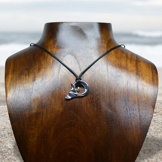 Whale spirit necklace. Made from highly polished, tarnish resistant silver, strung on a strong cord. © Adrian Ashley