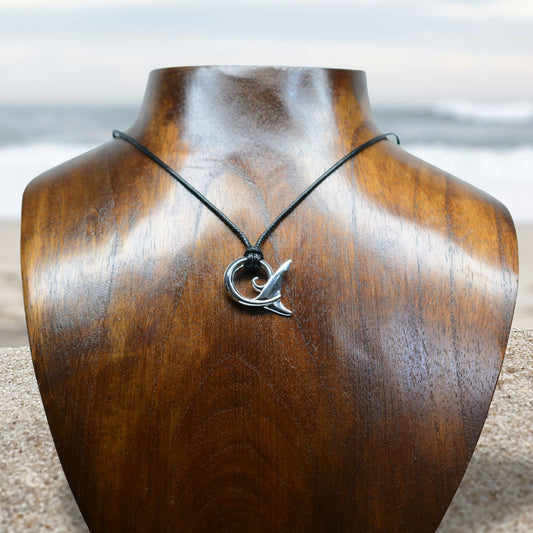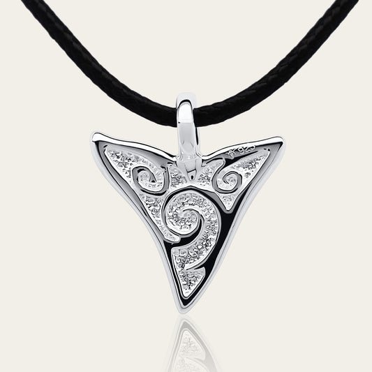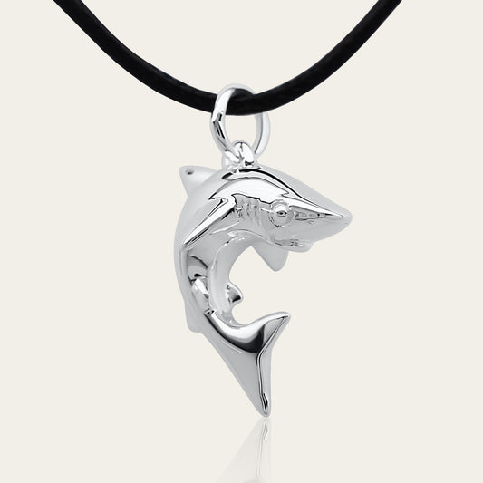Shark spirit necklace. Made from highly polished, tarnish resistant silver, strung on a strong cord. © Adrian Ashley