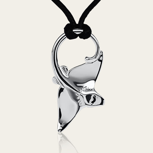 Eagle Ray necklace, Made from highly polished, tarnish resistant silver, double sided pendant, strung on a strong cord. © Adrian Ashley