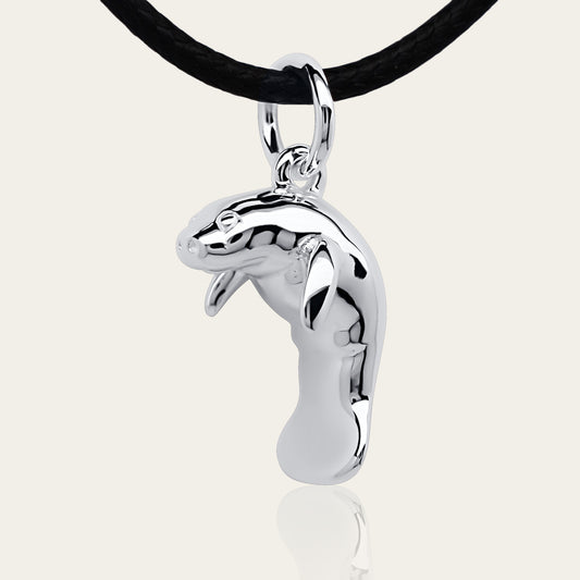 Manatee charm necklace. Made from highly polished, tarnish resistant silver, strung on a strong cord. © Adrian Ashley