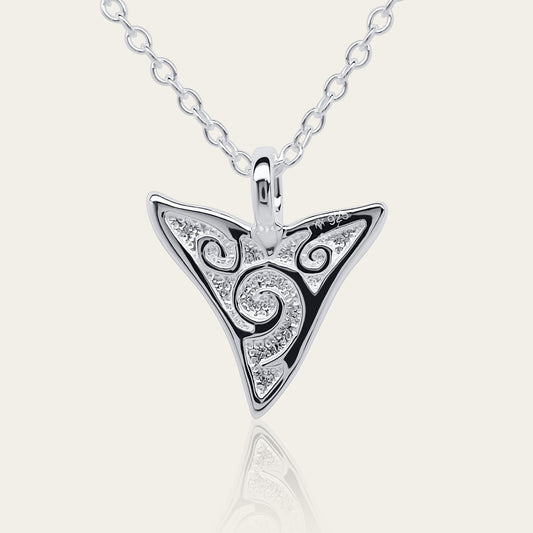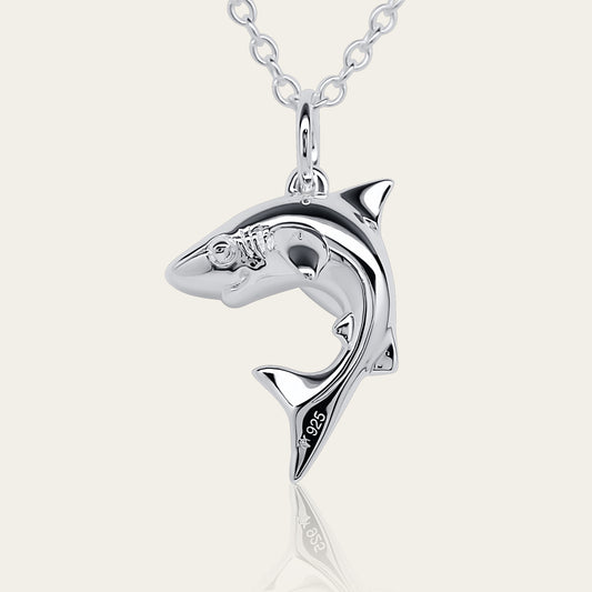 Shark spirit necklace. Made from highly polished, tarnish resistant silver, hung on a solid silver chain. © Adrian Ashley