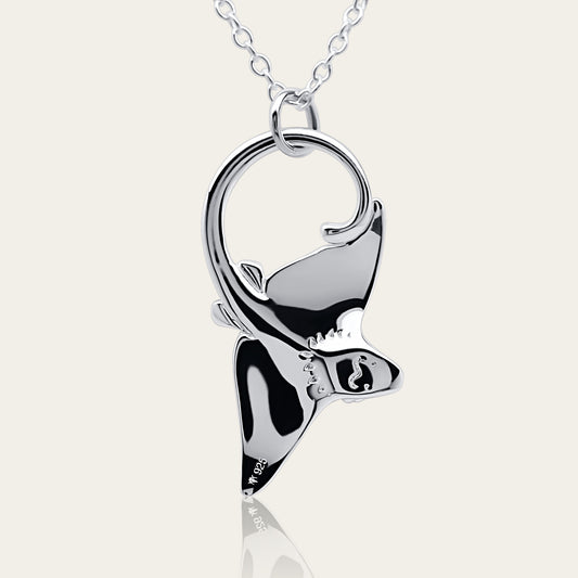 Eagle Ray necklace, Made from highly polished, tarnish resistant silver, double sided pendant, hung on a solid silver chain. © Adrian Ashley