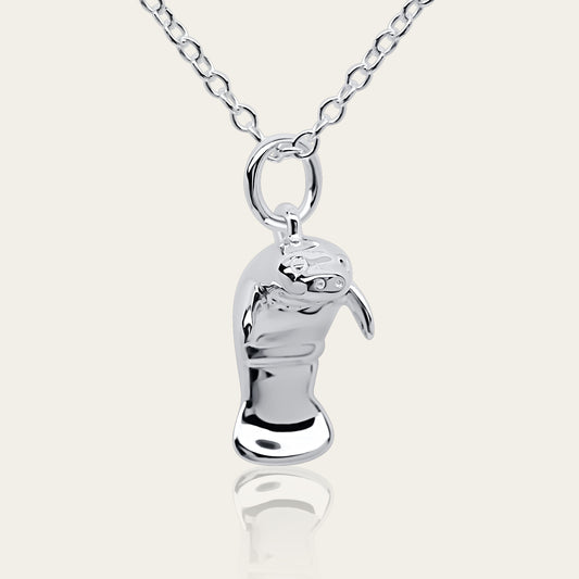 Manatee charm necklace. Made from highly polished, tarnish resistant silver, hung on a solid silver chain. © Adrian Ashley