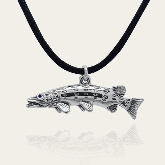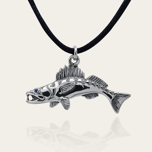 Zander fishing necklace. Made from sterling silver with an antiqued finish, set with a gemstone eye. Walleye pendant, ideal fisherman’s angling gift © Adrian Ashley