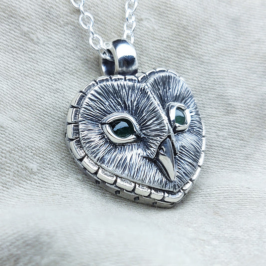 Emerald Barn Owl necklace, large sterling silver Barn Owl pendant with natural emerald eyes. © Adrian Ashley