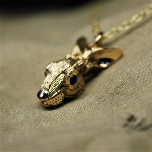 Gold rabbit necklace. Gold hare pendant with dark sapphire eyes and a gold chain. Hand made to order in the UK. © Adrian Ashley