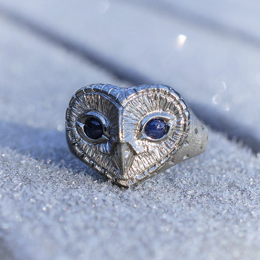 Silver and sapphire owl ring, platinum plated sterling silver barn owl with sapphire eyes. *This piece is ready to be shipped*© Adrian Ashley