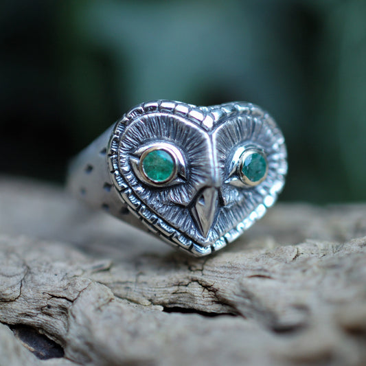 Owl ring, silver gold and emerald ring, sterling silver barn owl with gold and emerald eyes, antique finish. *This piece is ready to be shipped*