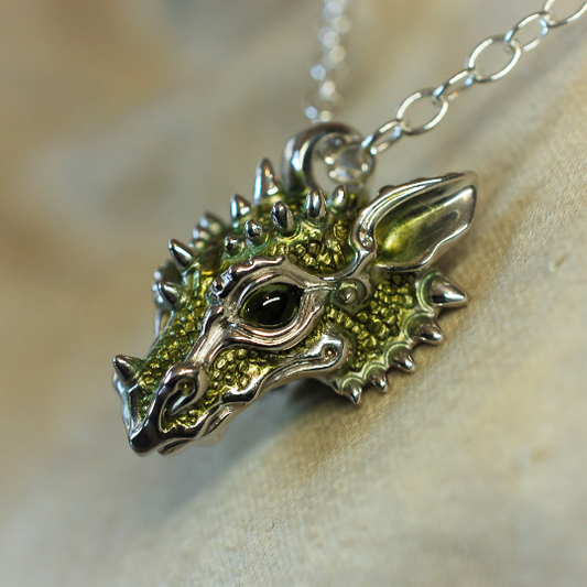 Green dragon necklace. Sterling silver dragon pendant, with natural peridot eyes and a solid silver chain. Handmade to order. © Adrian Ashley