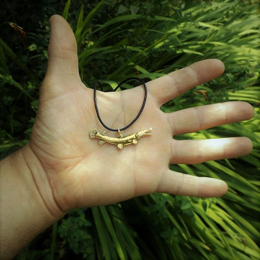 Gold gar necklace, garpike, or alligator gar fishing necklace, gold and diamond fisherman's charm pendant, made to order. © Adrian Ashley
