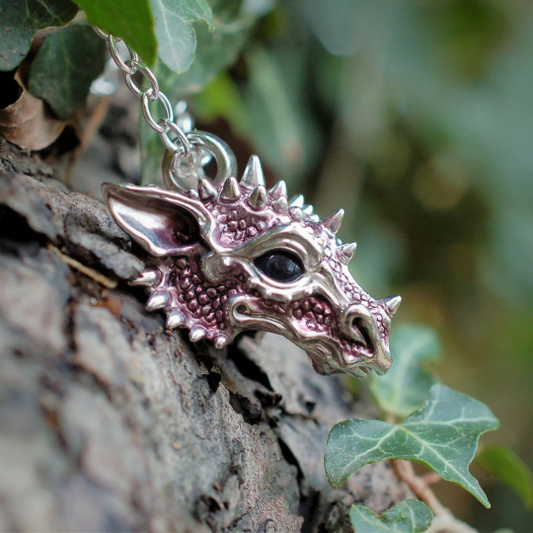 Purple dragon necklace. Sterling silver dragon pendant, with natural iolite eyes and a solid silver chain. Handmade to order. © Adrian Ashley
