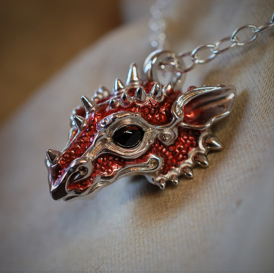 Red dragon necklace. Sterling silver dragon pendant, with natural garnet eyes and a solid silver chain. Handmade to order. © Adrian Ashley
