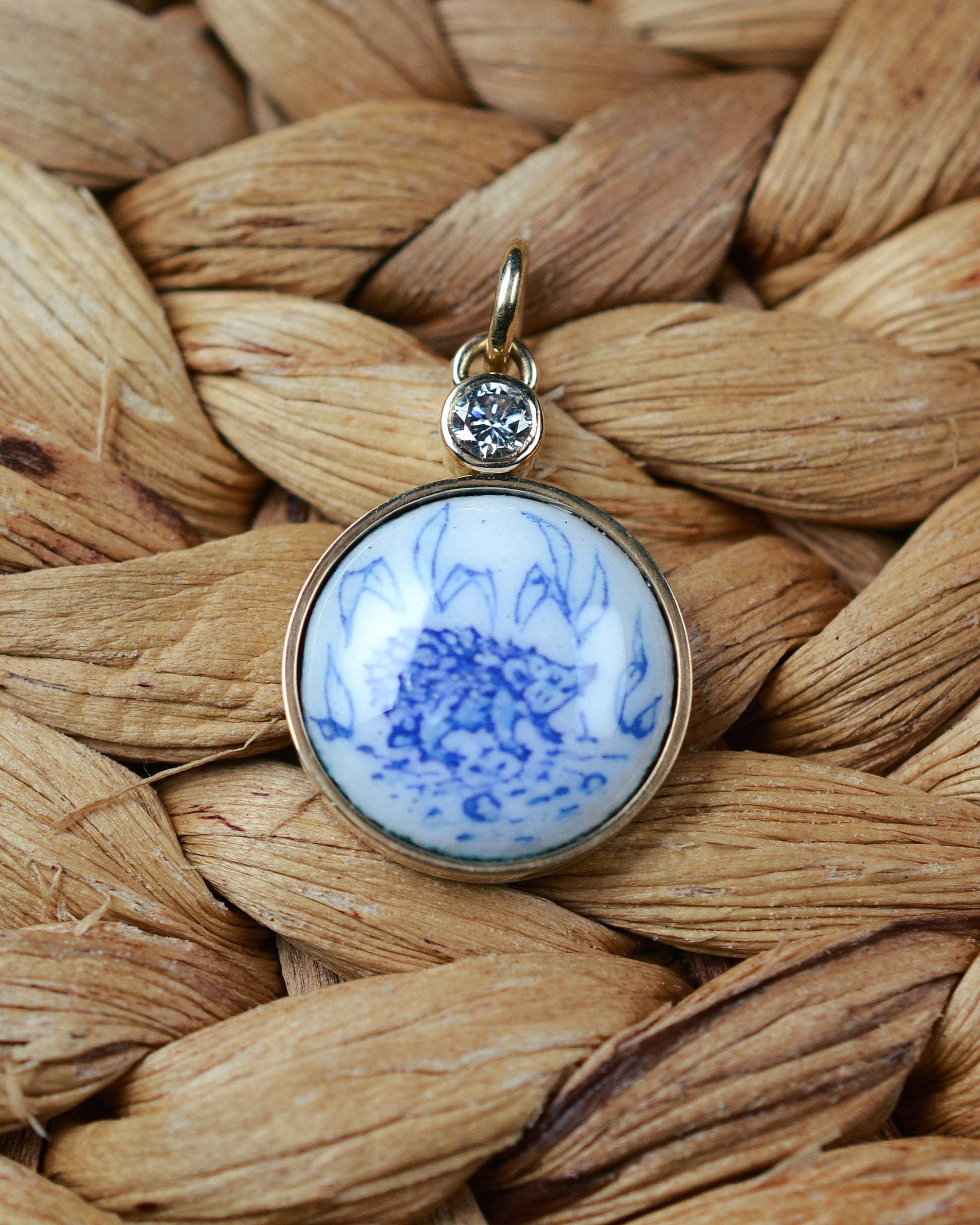 Enamelled gold and silver pendant with a hedgehog motif and natural diamond.