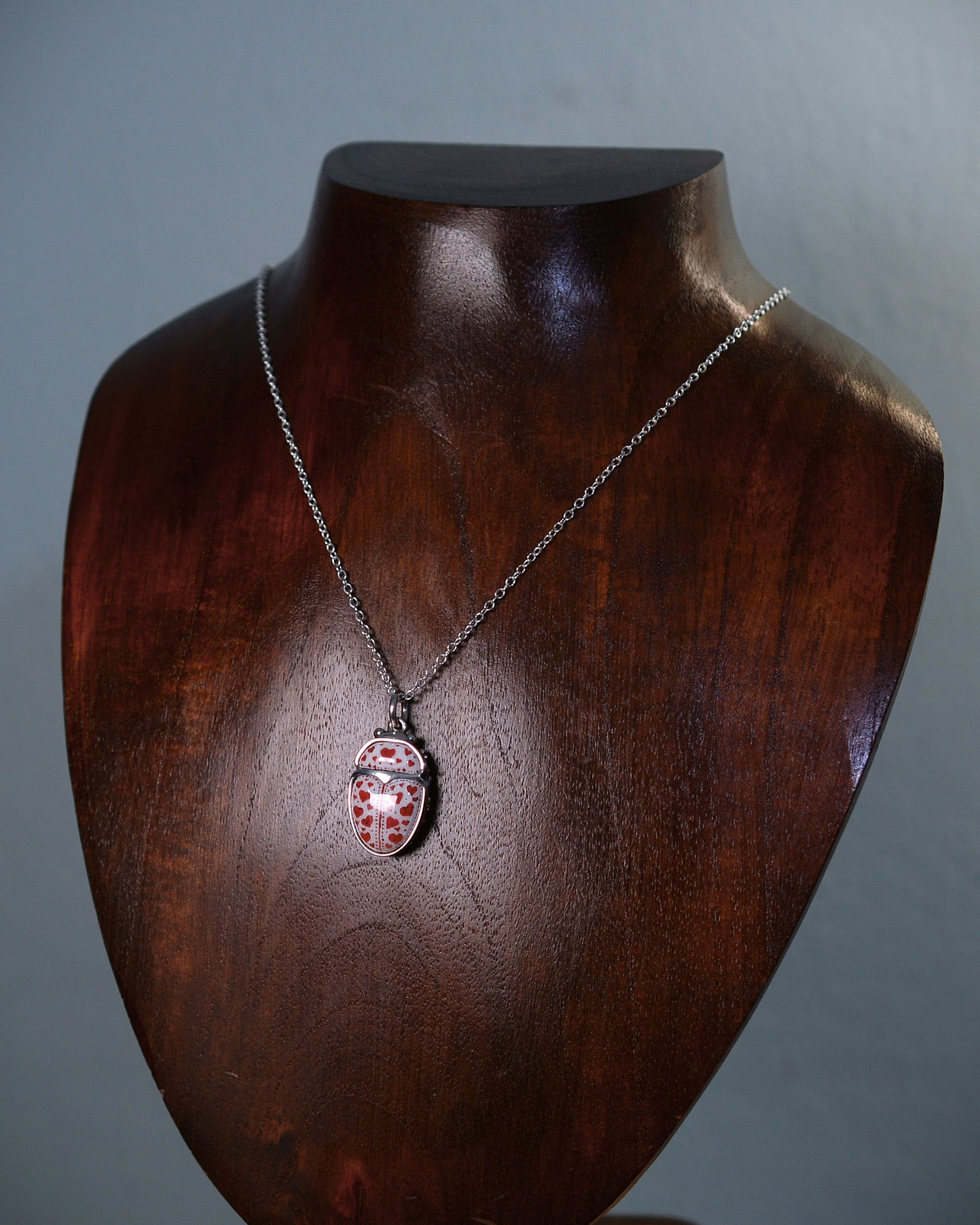 This pendant features a silver beetle design that was cast from a hand carved master pattern. The beetle's thorax and wing cases are made from enamelled plates decorated with a hearts design.