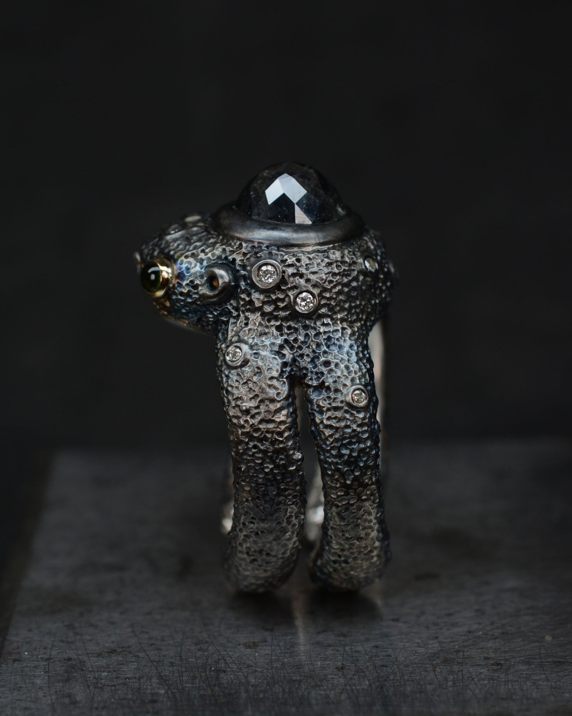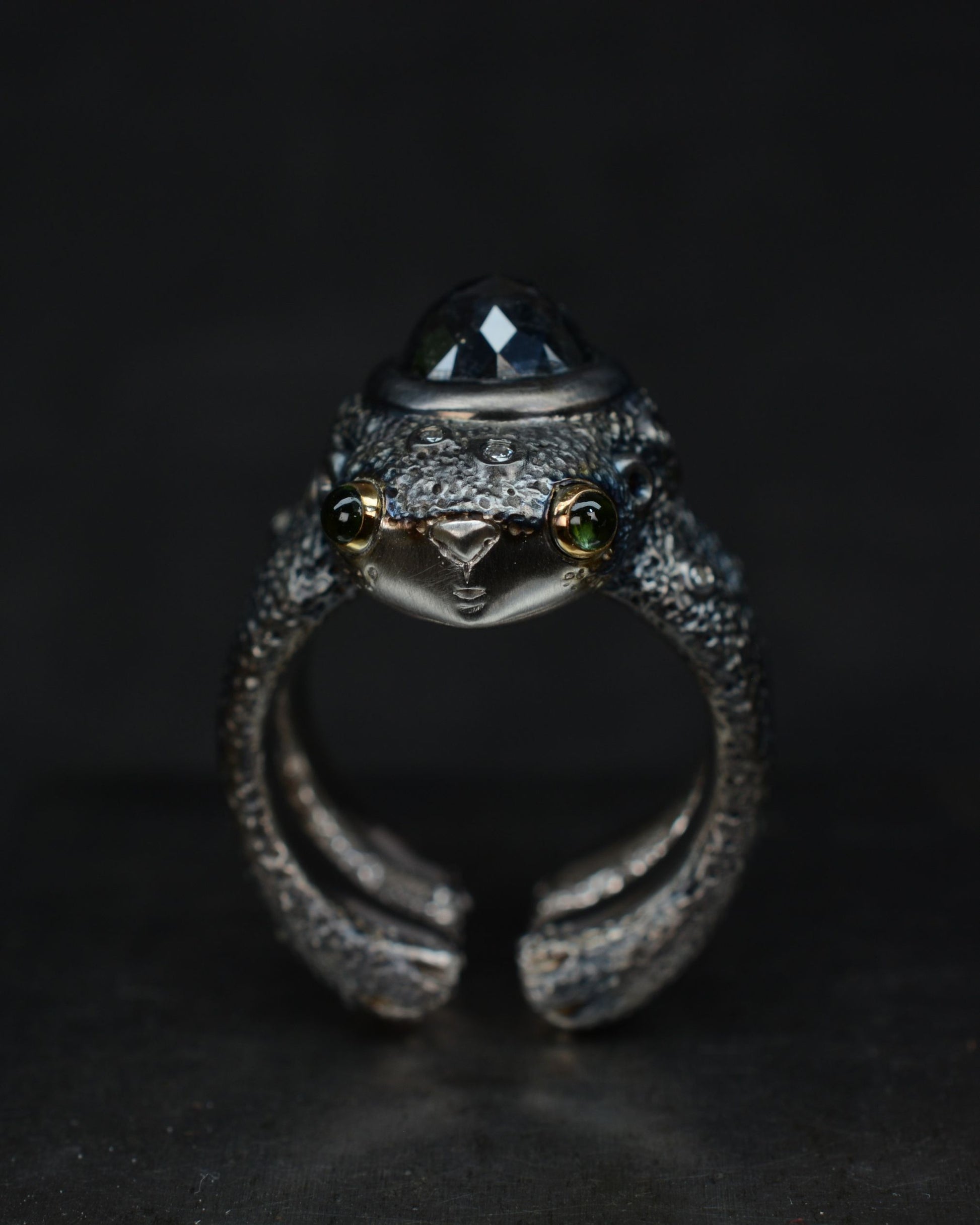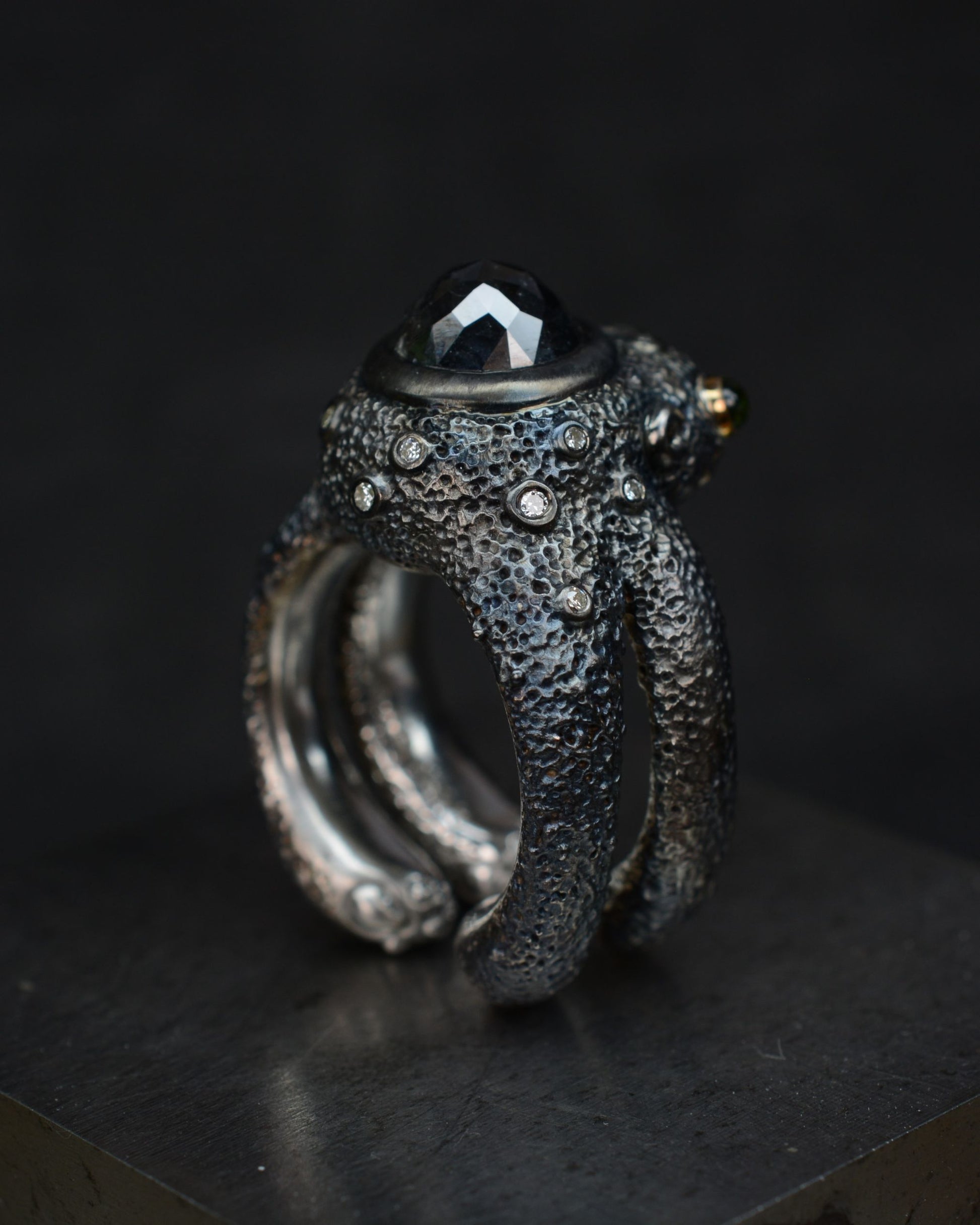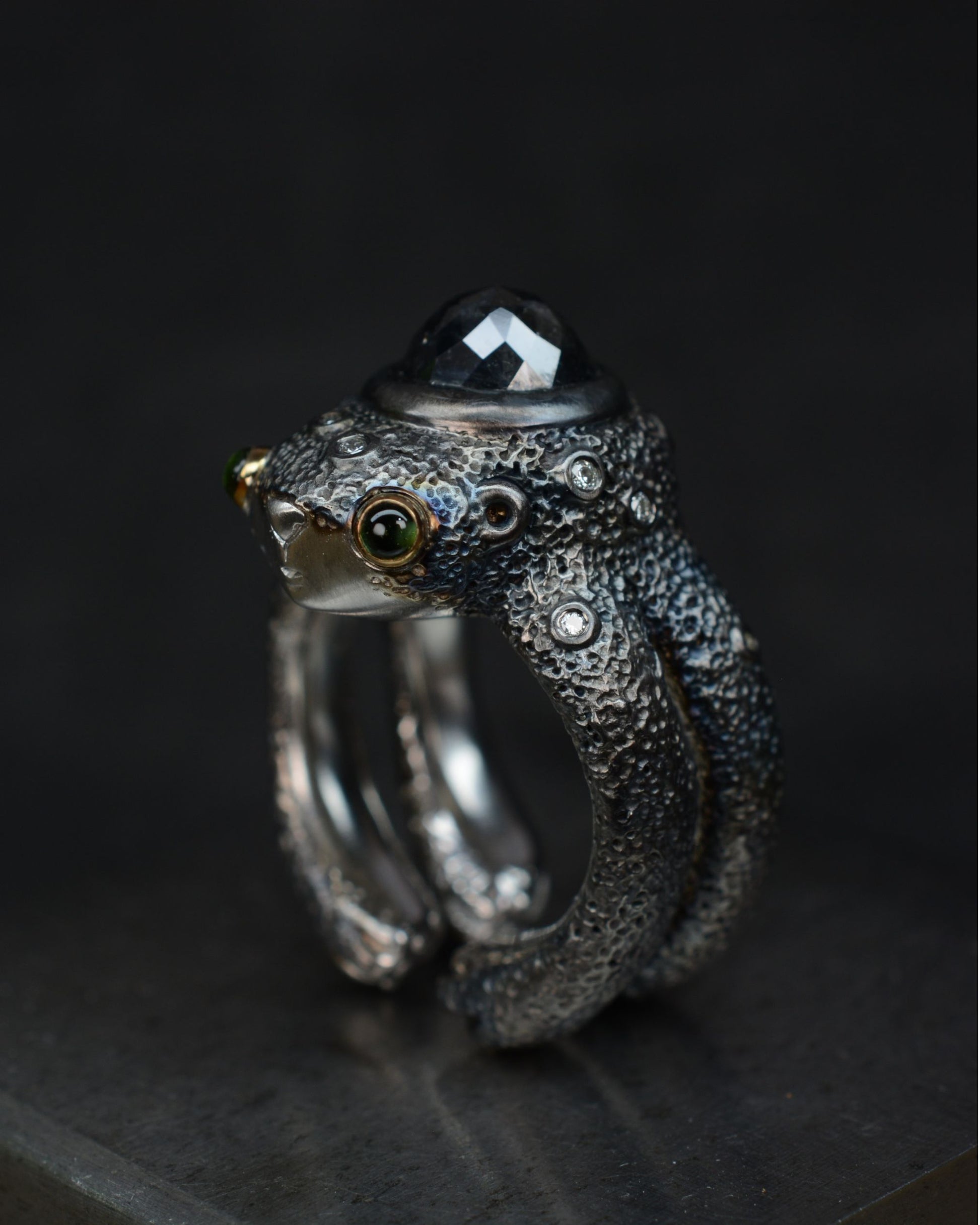Unique piece made from hand-carved models. Made using a 2.88ct 8.5mm black, rose cut natural diamond, silver, 18ct yellow gold, green tourmalines, brilliant cut round diamonds.