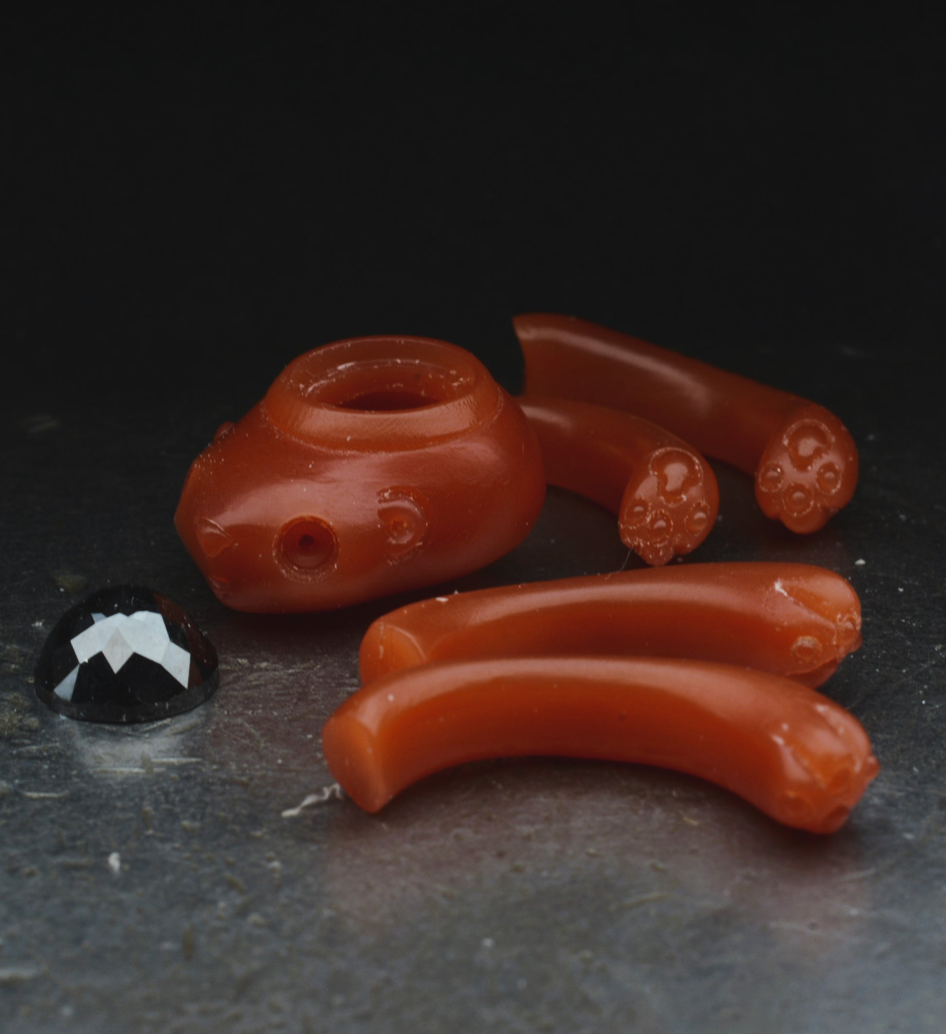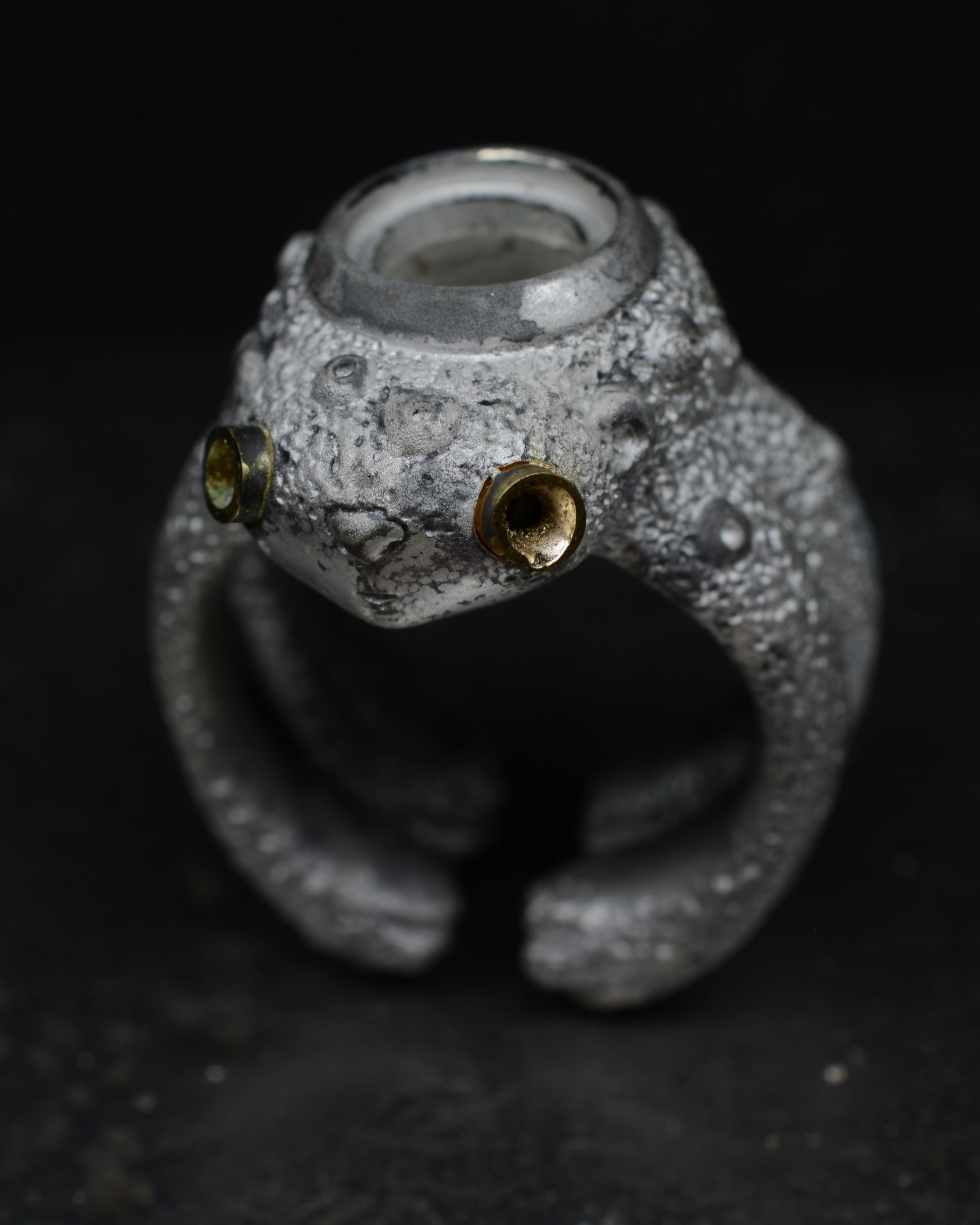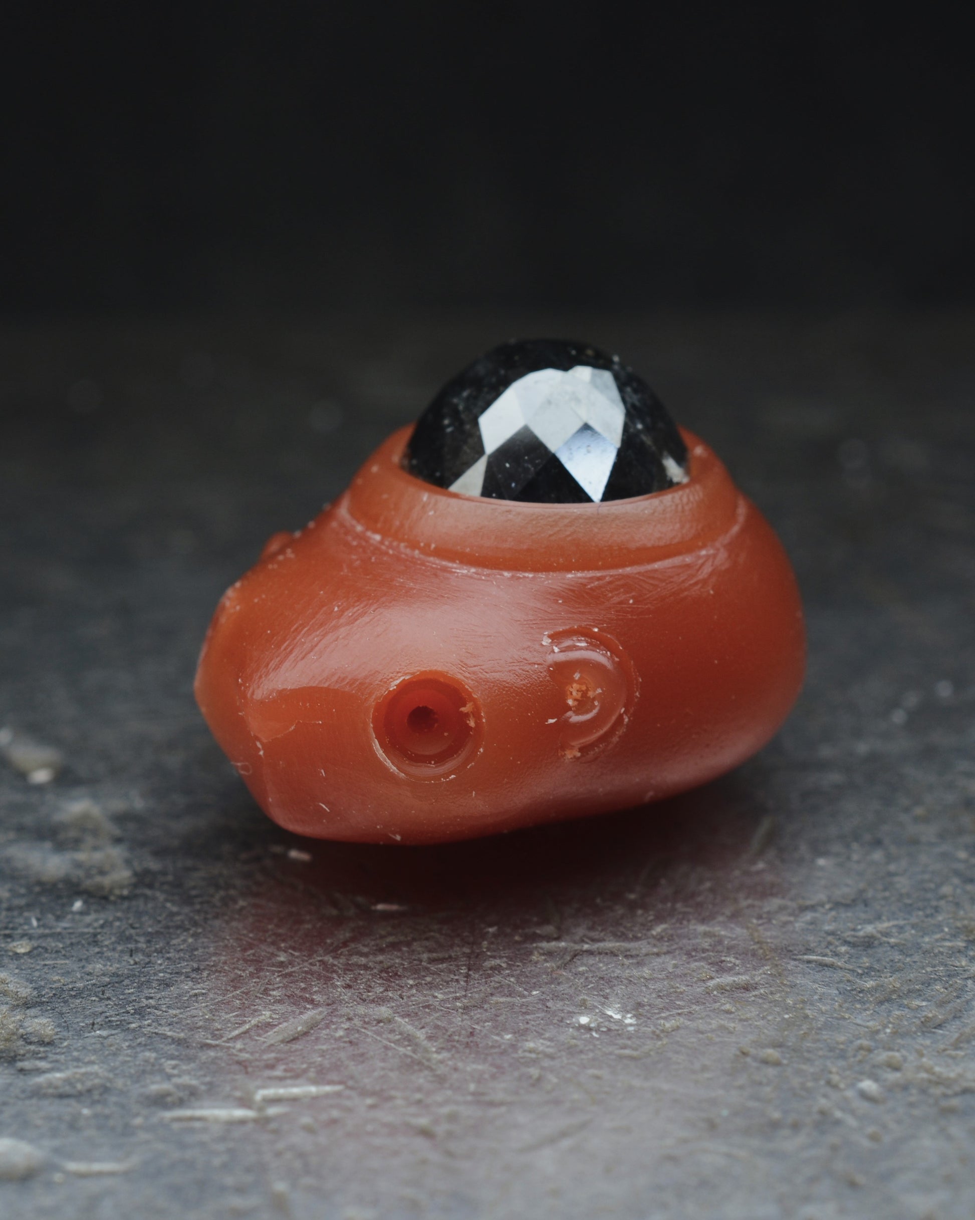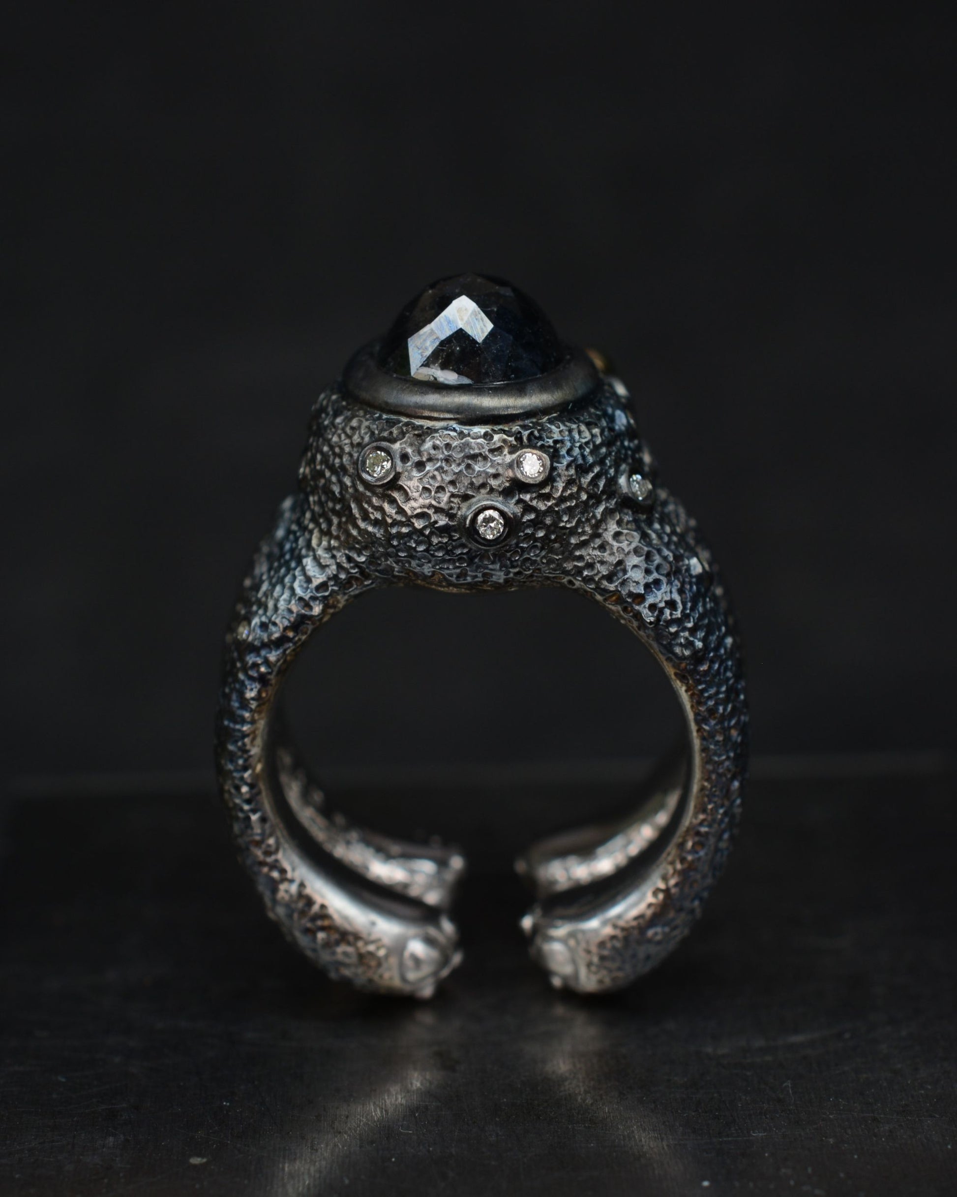 Unique piece made from hand-carved models. Made using a 2.88ct 8.5mm black, rose cut natural diamond, silver, 18ct yellow gold, green tourmalines, brilliant cut round diamonds.