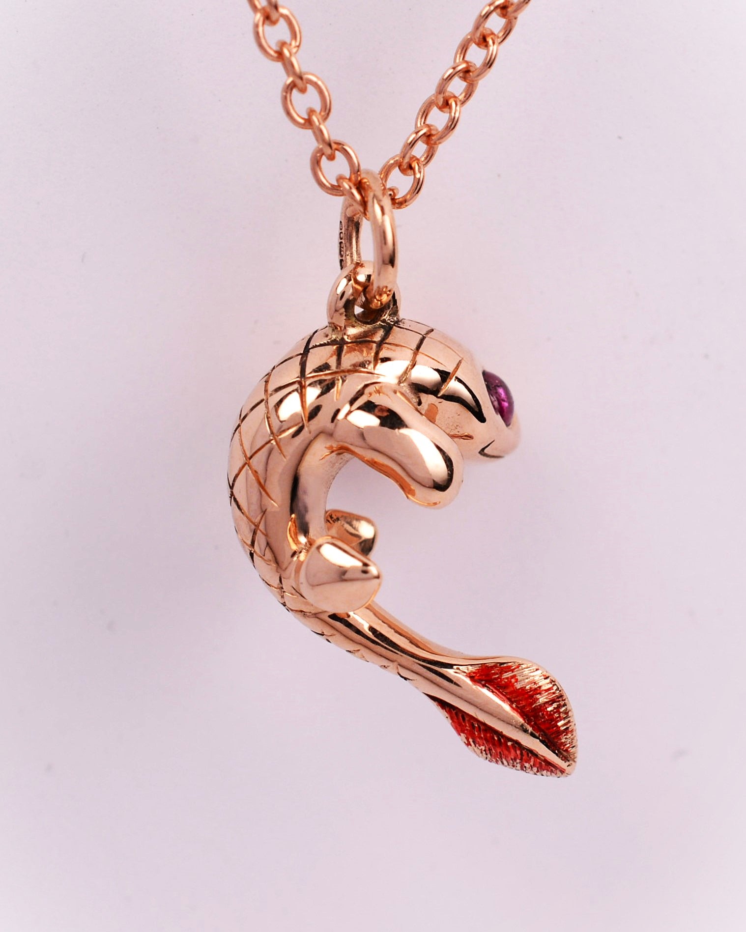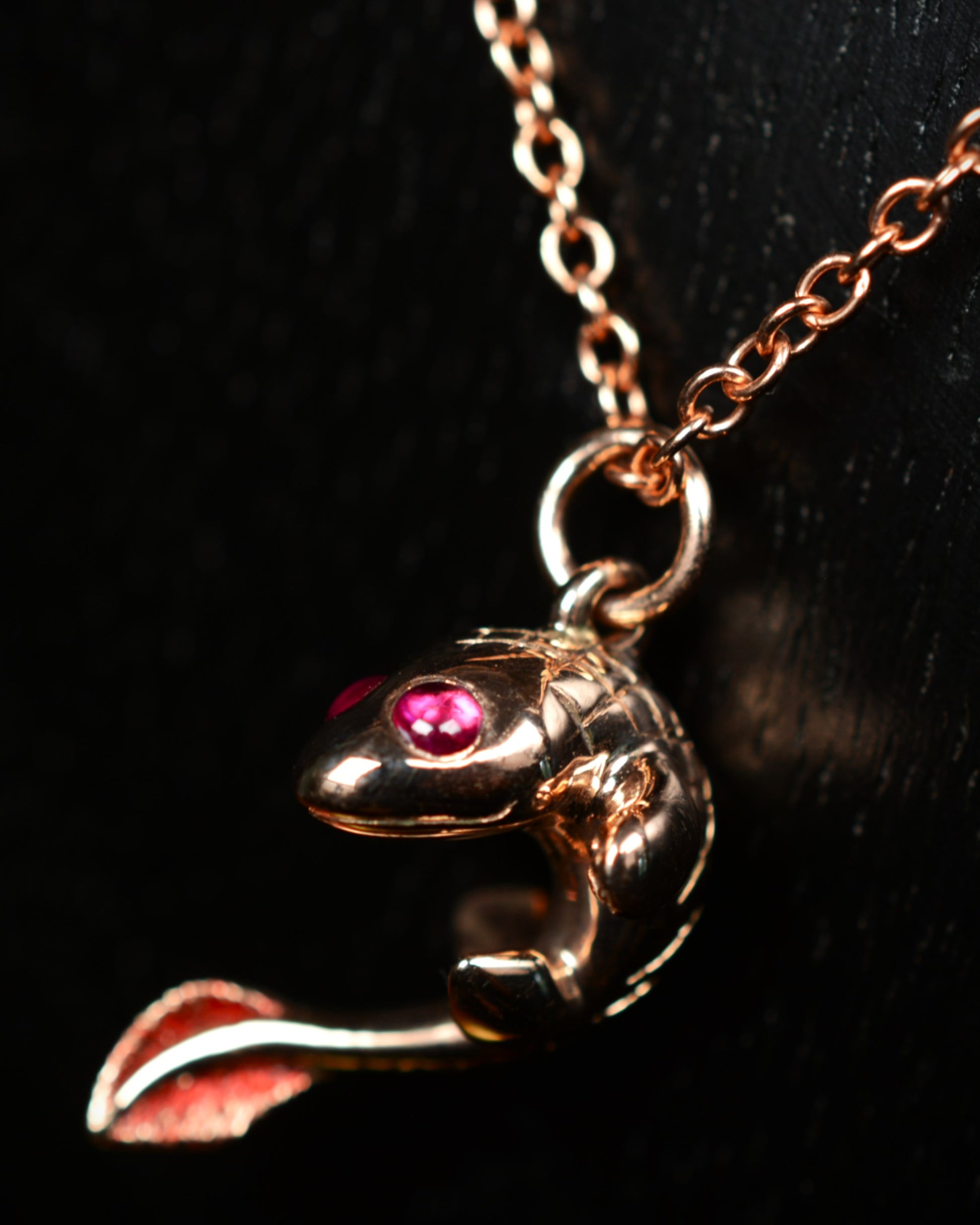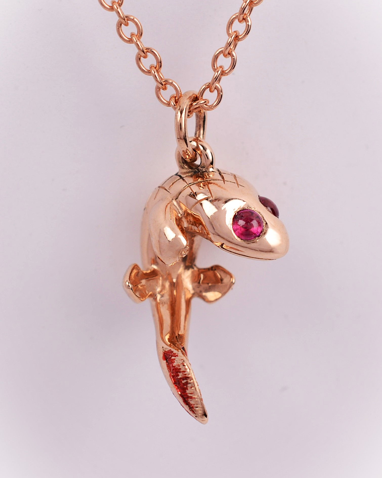 This little creature is made from hallmarked 9ct red gold that has been recycled from a piece of Victorian Jewellery. Set with a pair of cabochon cut rubies and supplied on a sturdy 9ct red gold trace chain.