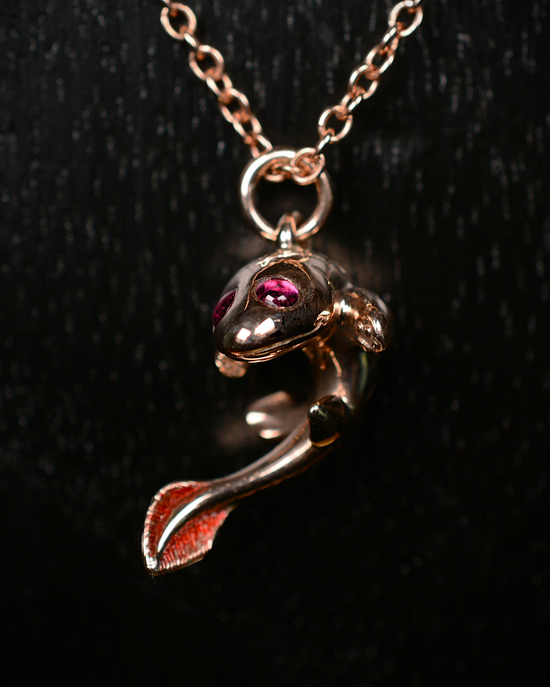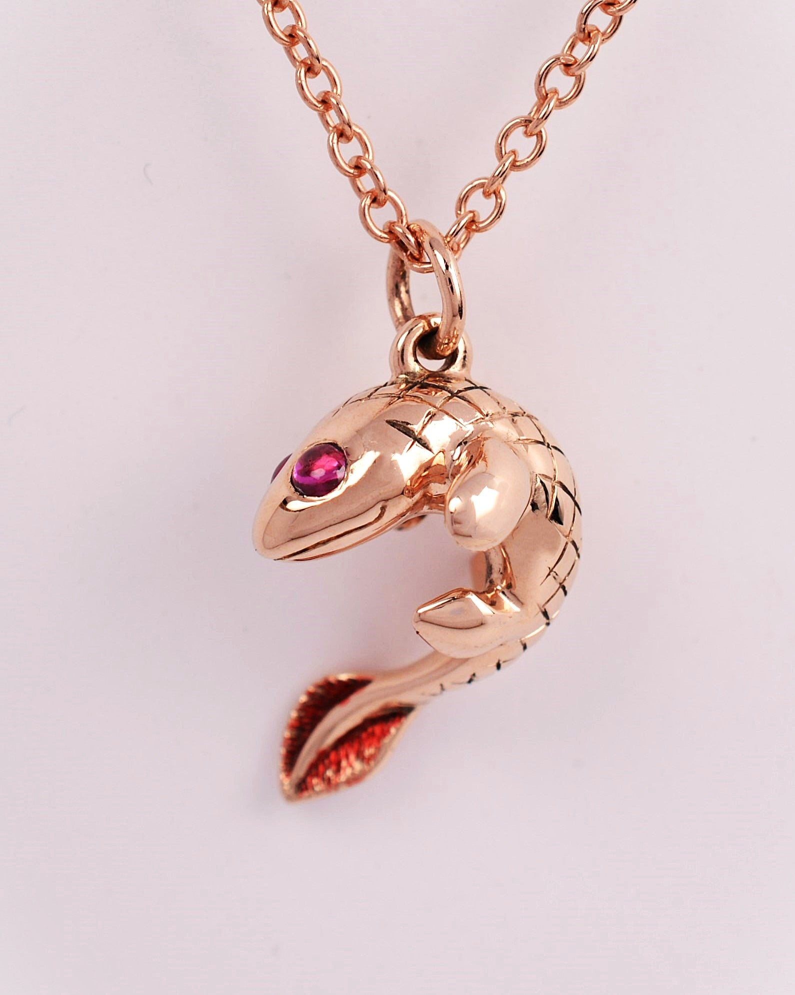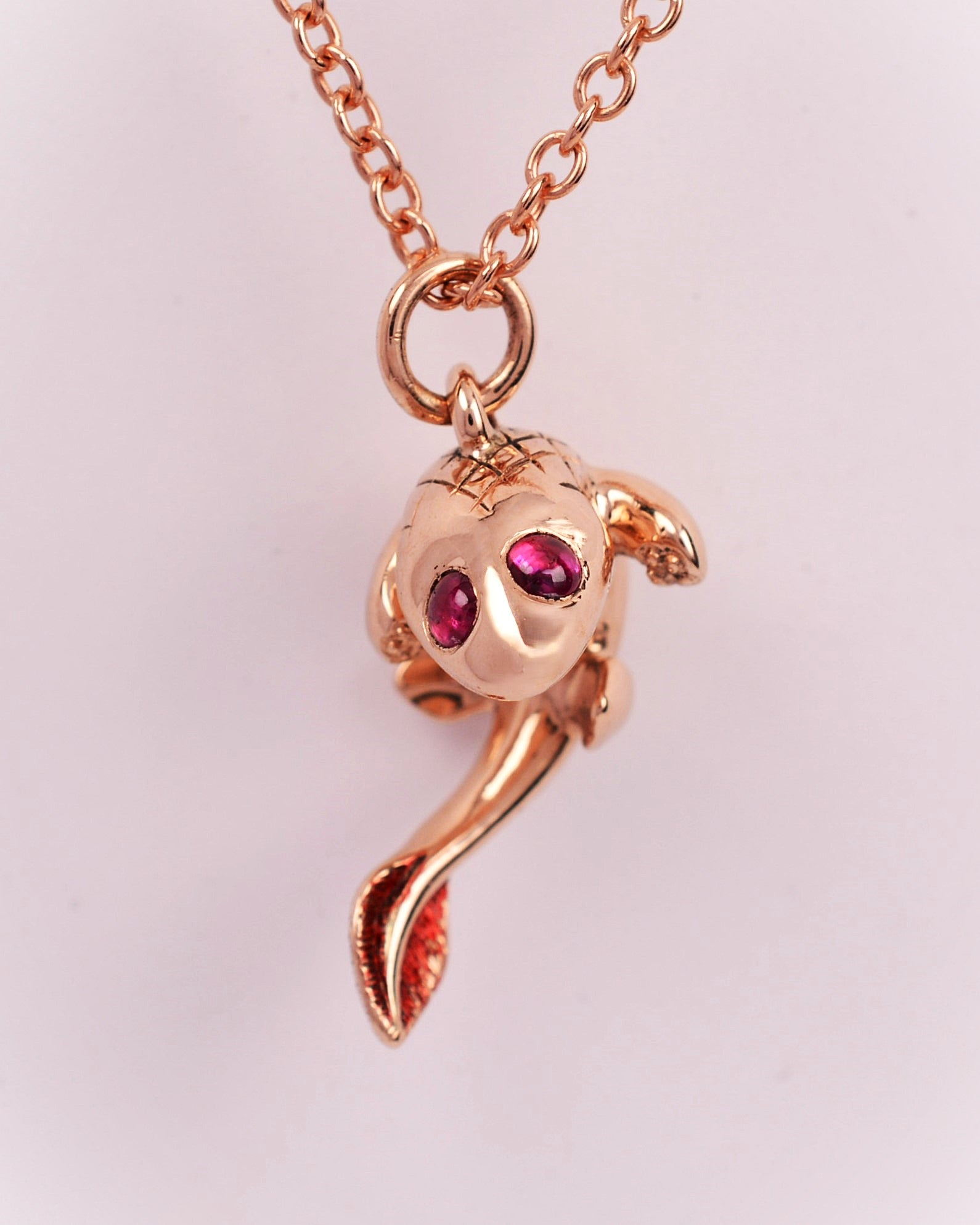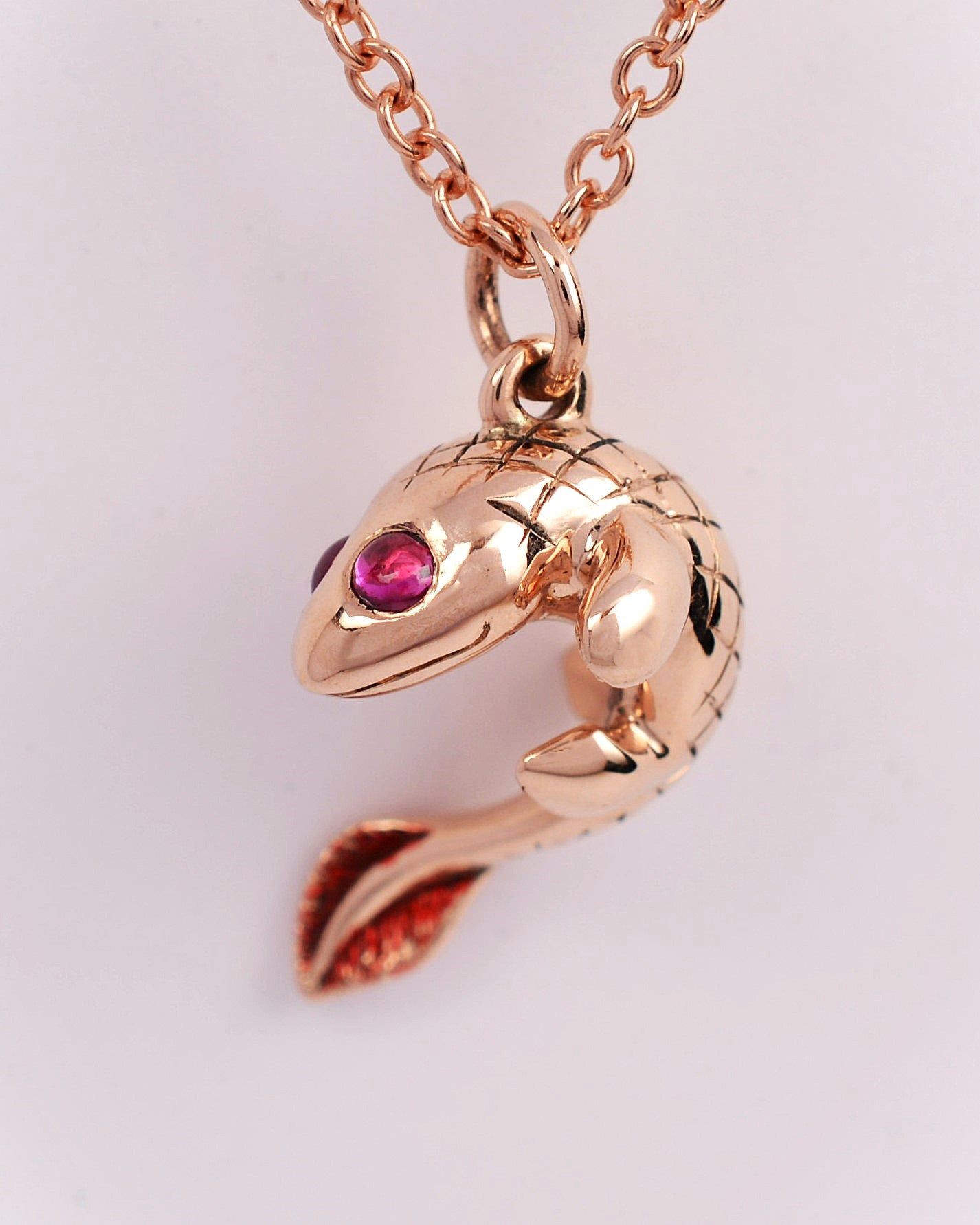 This little creature is made from hallmarked 9ct red gold that has been recycled from a piece of Victorian Jewellery. Set with a pair of cabochon cut rubies and supplied on a sturdy 9ct red gold trace chain.