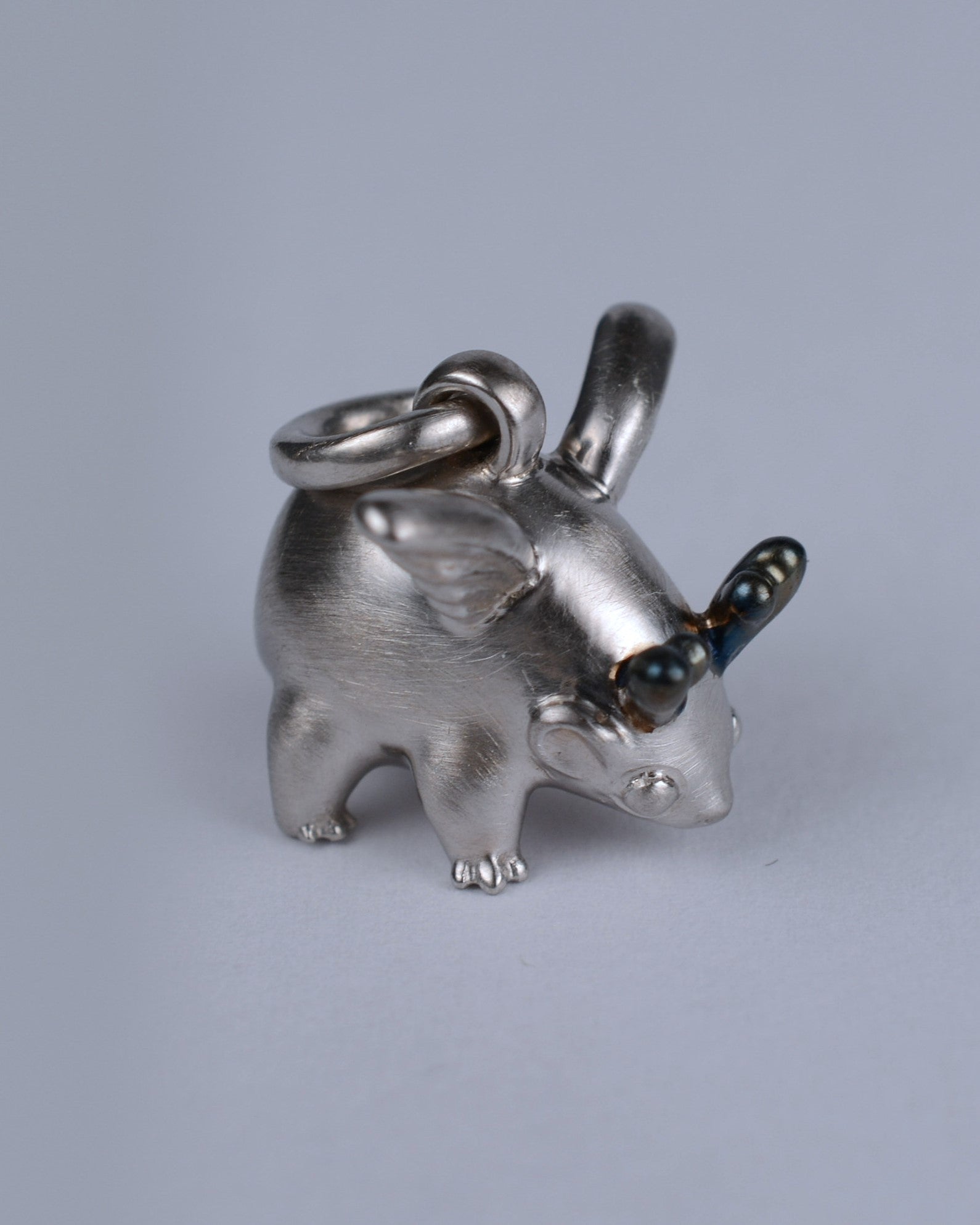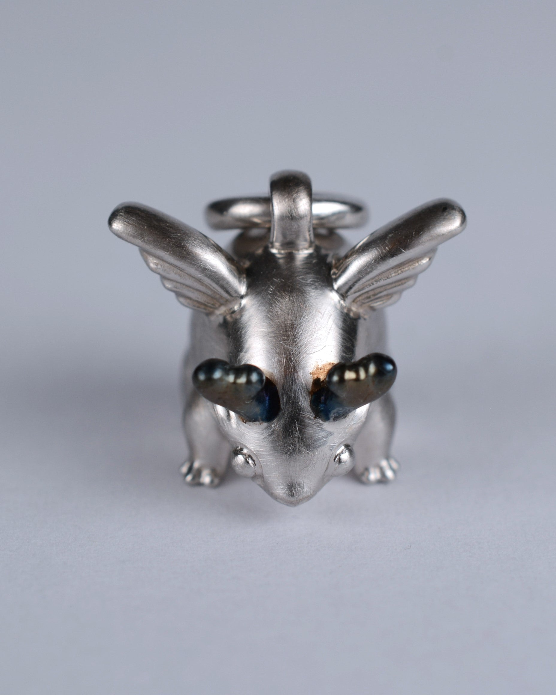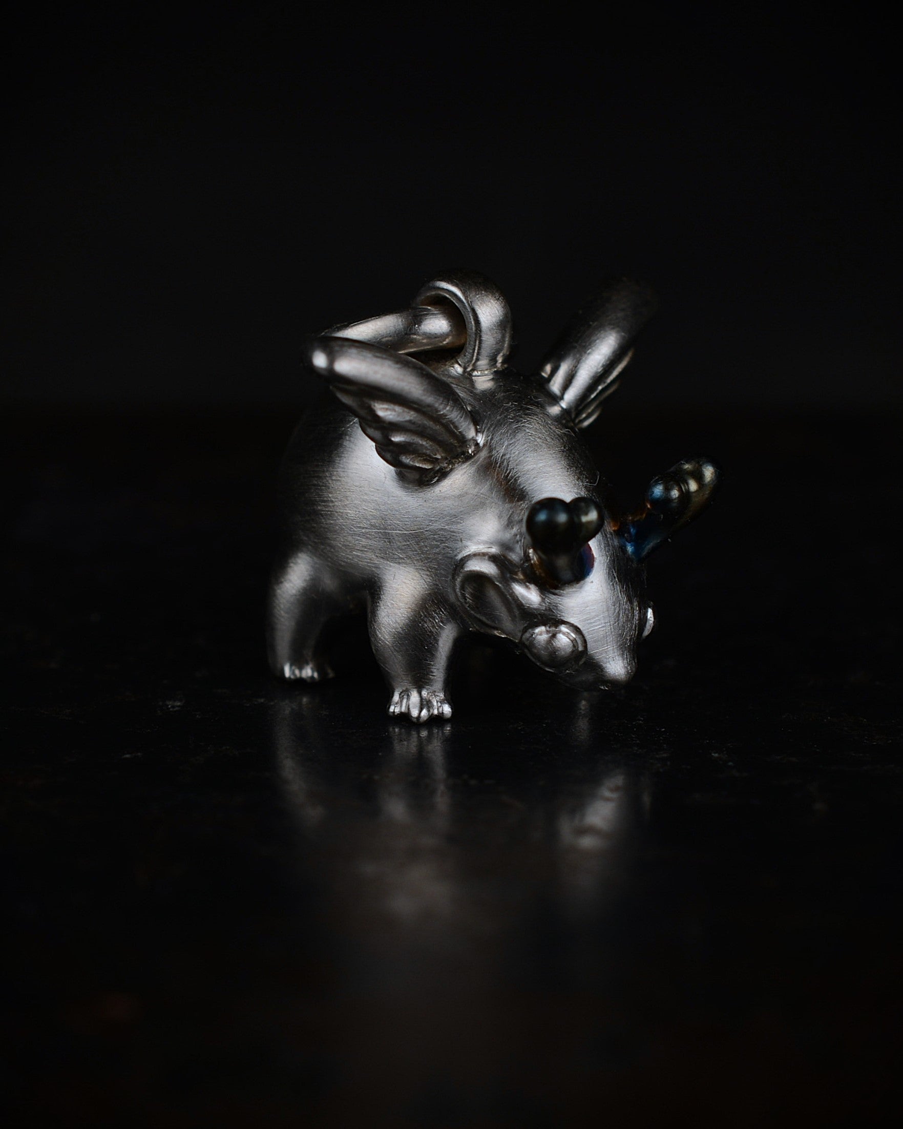 Made from platinum-coated sterling silver with black rhodium plated horns and a silver chain.