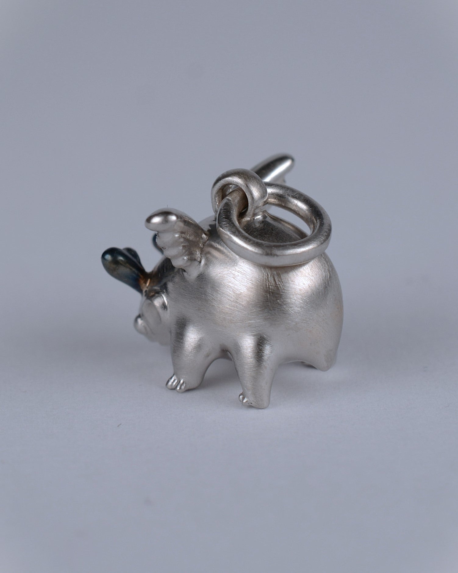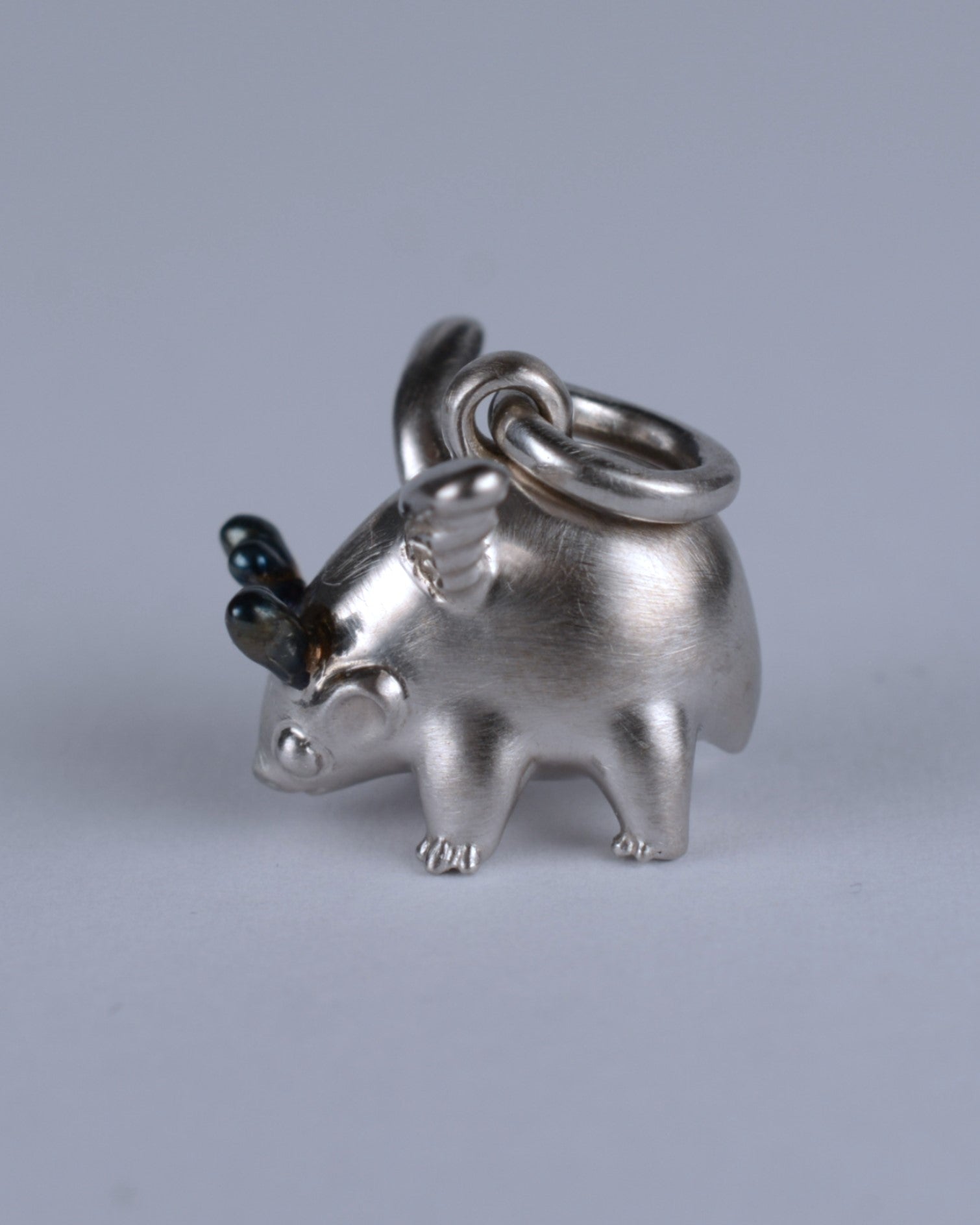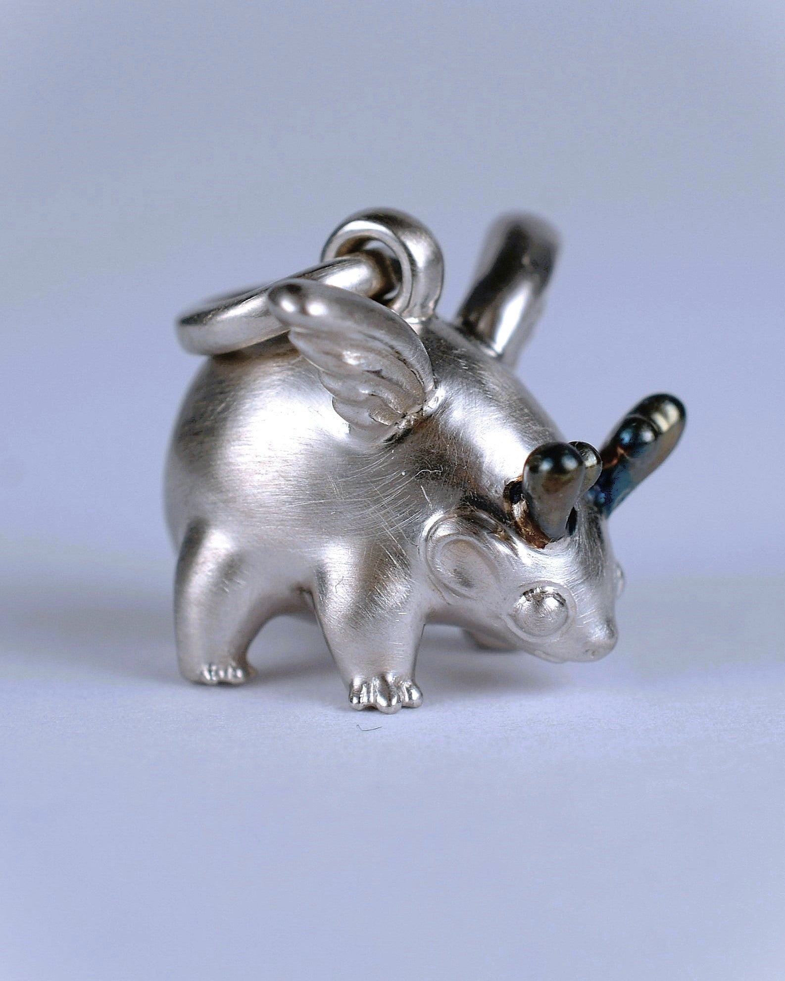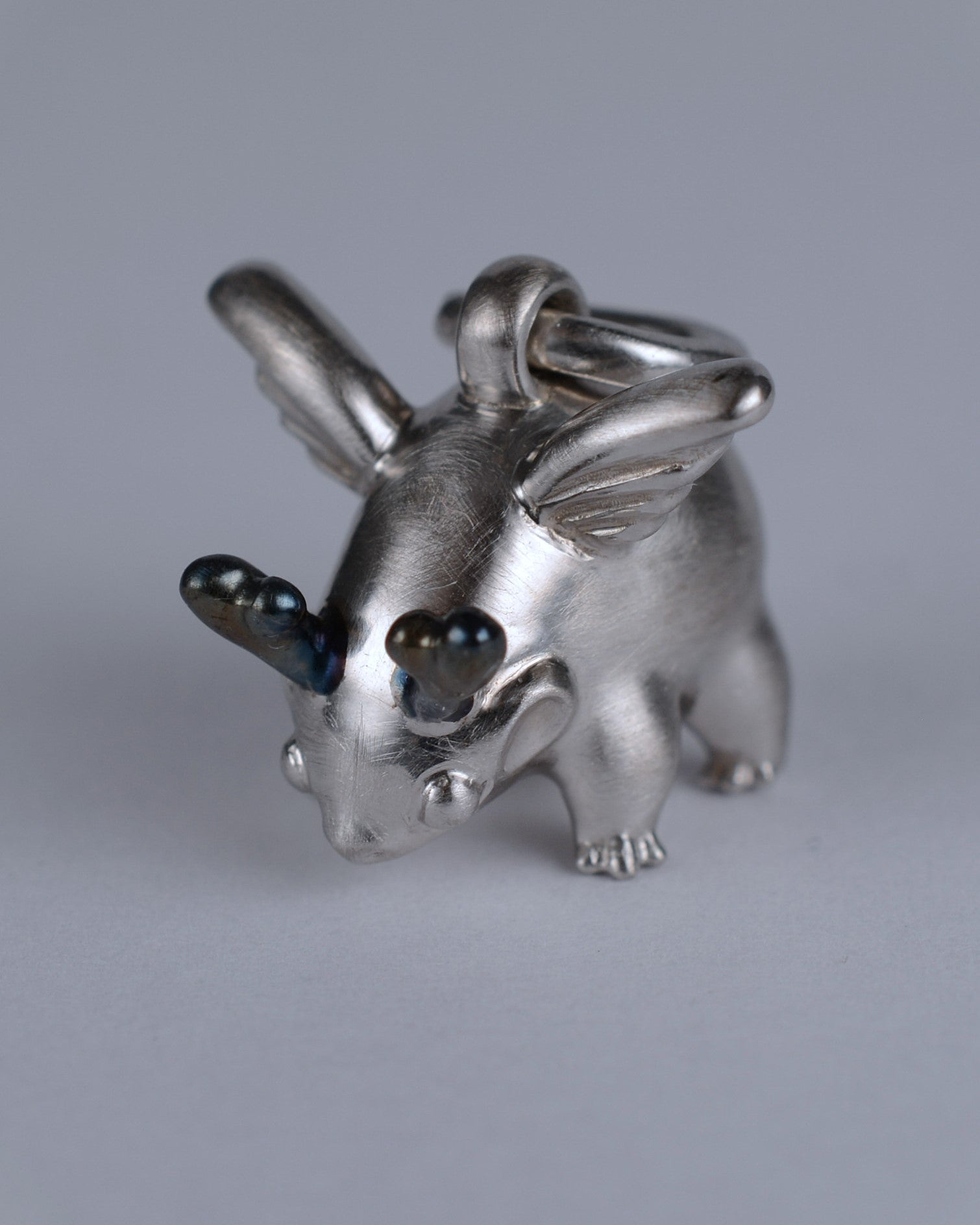 Made from platinum-coated sterling silver with black rhodium plated horns and a silver chain.
