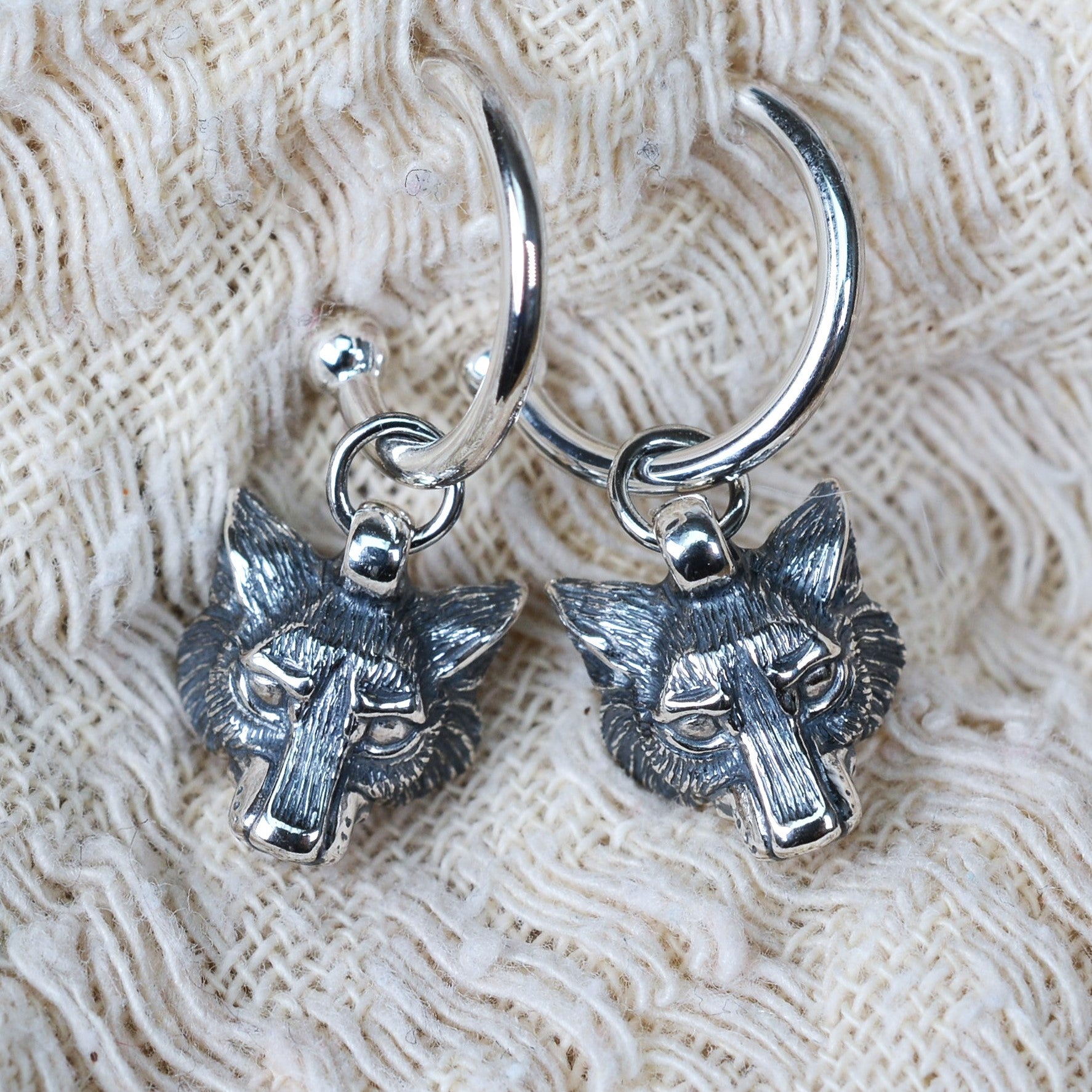 The oxidised, solid silver wolves' heads measure 1.2cm from the tip of their noses to the tips of their ears. The earrings themselves are made from solid sterling silver. The hoops are approximately 14mm in diameter, made from 1.5mm thick wire, with posts that have sturdy fittings attached.