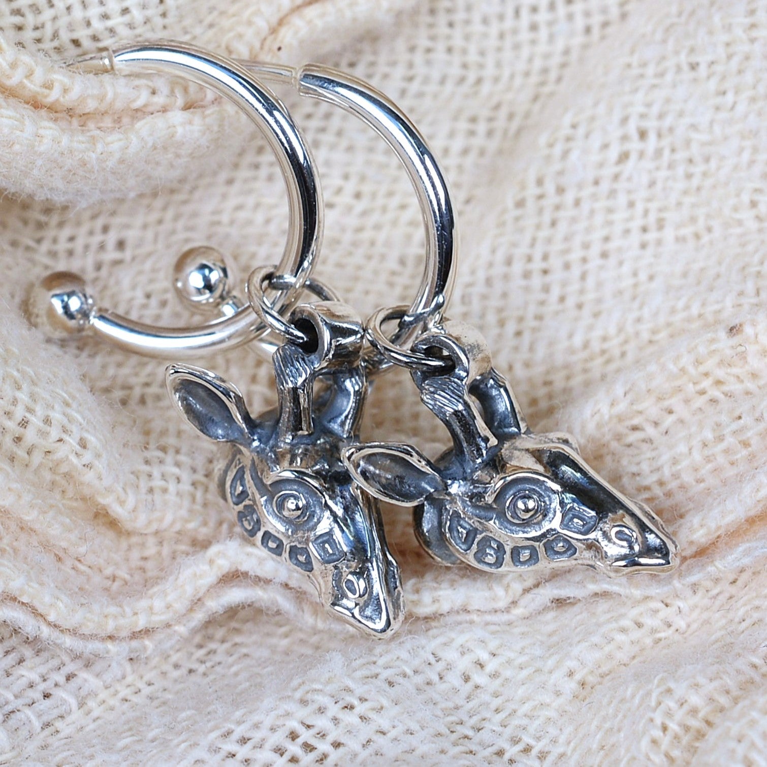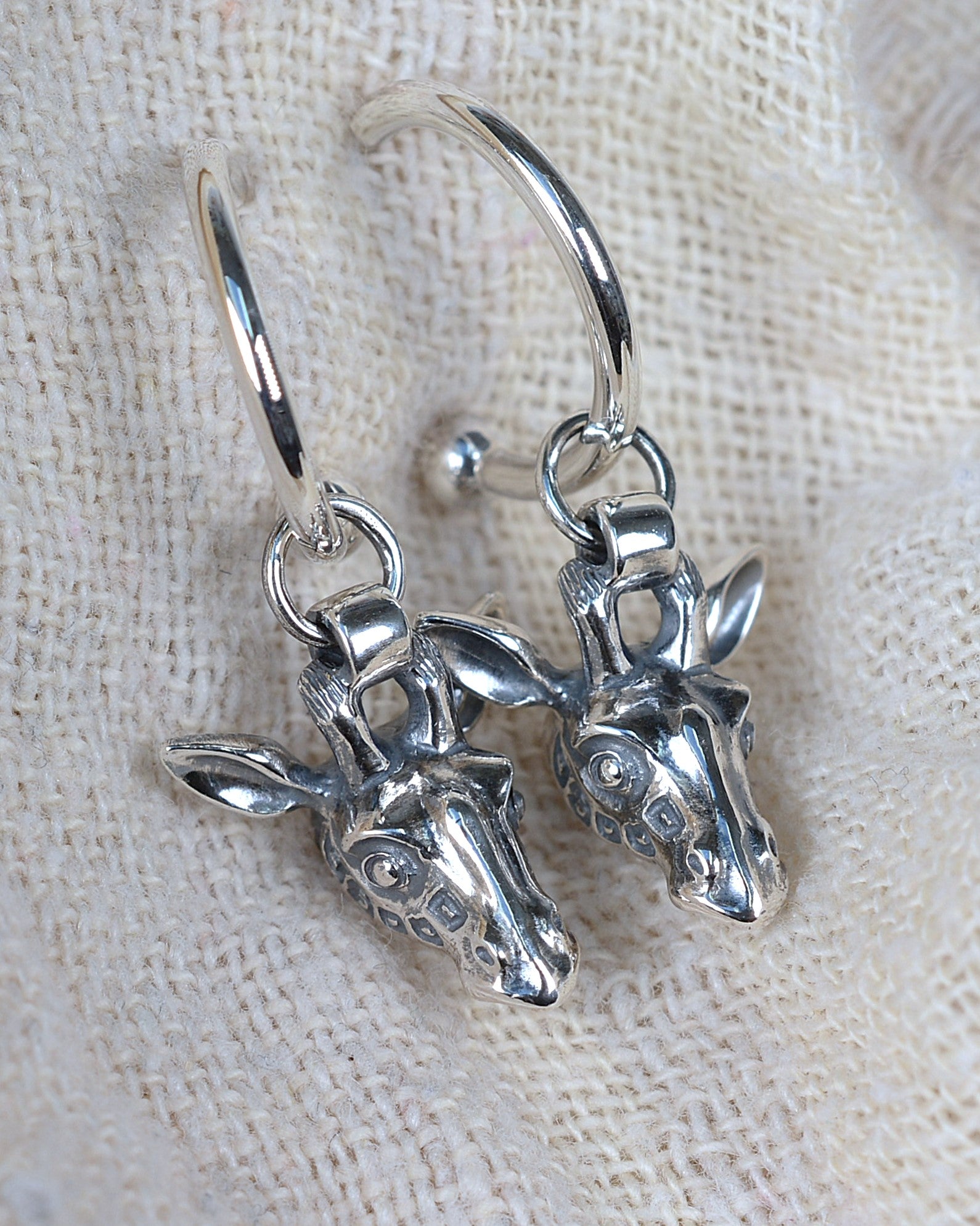 The oxidised, solid silver giraffe heads measure 1.4cm from the tip of their noses to the tips of their ears. The earrings themselves are made from solid sterling silver. The hoops are approximately 14mm in diameter, made from 1.5mm thick wire, with posts that have sturdy fittings attached.